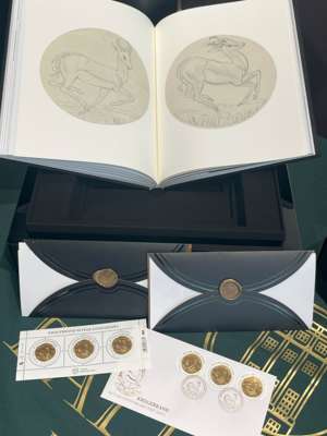 South Africa, gold Proof 5 Oz Krugerrand, 2017, 50th Anniversary of Krugerrand 1967-2017 with the special privy mark, 169.63g, 50mm, fineness .916 (N. 297730).Uncirculated Proof. Mintage of only 500 pieces. Please note that the capsule the coin is housed in is cracked. Extremely rare. Featuring an impressive presentation set with a certificate of authenticity, an exclusive book, first day cover and a large display box in solid wood. Please note that the display box shipping is payable separately by the buyer or collection only.