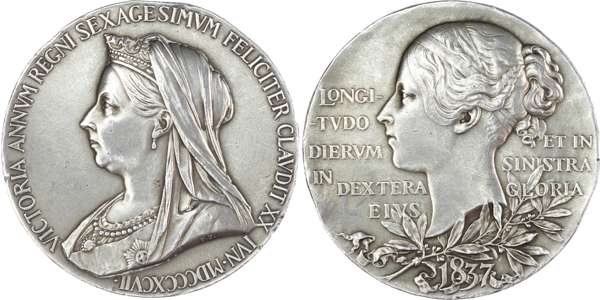 Victoria 1837-1901, Diamond Jubilee of Queen Victoria, 1897, Official Royal Mint Small Silver Medal (55mm/85.25gm) by G. W. de Saulles after T. Brock. Veiled bust of Victoria left. Rev. Young bust of Victoria as she came to the throne 60 years previously, olive branch below (BHM 3506; Eimer 1817a). Good Very Fine, several edge knocks, in original box of issue (sound).
