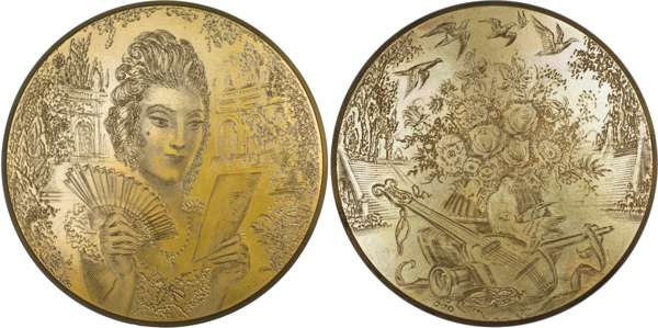 France, 20th Century Bronze Art Medal (113mm/446.56gm) by Albert Decaris (1901-1988). Woman holding fan and picture, classical structures to sides, foliage around. Rev. Bouquet of flowers, birds above and below, instruments below, staircases to sides, foliage around. One of the best French engravers of the 20th century, Decaris is notable for being the last person to ever win an Olympic Gold Medal for Etching and Engraving. Extremely Fine, rich olive tone with subtle iridescent, particularly to reverse.