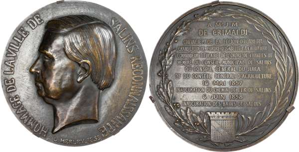 France, Jean‑Marie de Grimaldi, 1859, Pair of Bronze Medals by Eck et Durand / L. Merley. The former mayor and former director of Les Salines, Grimaldi built the famous baths from 1853 to 1855, on the site of the small salt works which he had owned since 1843. Bust of Grimaldi left, TRIBUTE OF THE GRATEFUL CITY OF SALINS (Translated legend). Rev. Blank. (207mm/563.44gm). TO MR. J. M. / DE GRIMALDI / KNIGHT OF THE LEGION OF HONOUR / GRAND CROSS OF THE ORDER OF ISABELLA THE CATHOLIC / TITULAR COMMANDER OF THE ORDER OF CHARLES III / MEMBER OF THE MUNICIPAL COUNCIL OF SALINS / OF THE GENERAL COUNCIL OF JURA / AND OF THE GENERAL COUNCIL OF AGRICULTURE / 16 MAY 1857 / INAUGURATION OF THE SALINS RAILWAY / 6 JUNE 1858 / INAUGURATION OF THE BATHS OF SALINS (Translated), inscription surrounded by laurel wreath, coat of arms of the city at the intersection of the two branches. Rev. Blank. (214mm/504.69gm). Both Extremely Fine, rich brown toning.