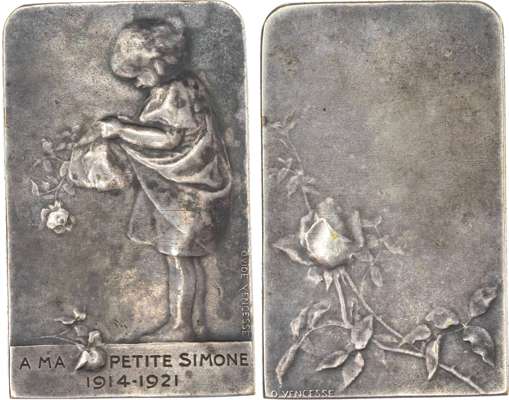 France, “L’Enfant Aux Roses”, 1921, Silvered Bronze Love/Marriage Plaquette (53x33mm/43.90gm) by Ovide Vencesse. Young child holding roses, in exergue, A MA PETITE SIMONE 1914‑1921. Rev. Branch of roses. Extremely Fine.