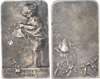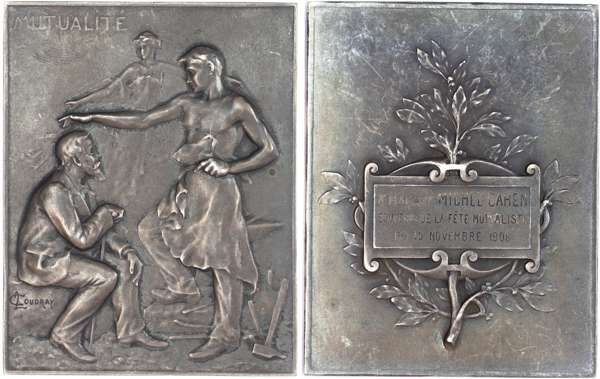 France, “Mutualité”, 1906, Silver Plaque (71x56mm/139.98gm) by L. Coudray. An old man seated right facing a blacksmith standing on the left, spirit in the background. Rev. Inscribed: A MADAME MICHEL CAHEN SOUVENIR DE LA FETE MUTUALISTE DU 10 NOVEMBRE 1906, on plate with branch and leaves around. Extremely Fine, blue/grey toning, particularly on reverse.