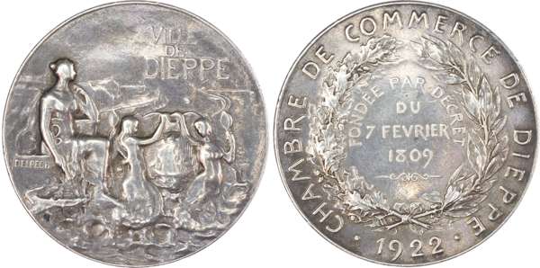 France, Dieppe (Normandy) Chamber of Commerce, 1922, Silver Medal (40mm/33.73gm) by J. Delpech. Allegory in front of the port of Dieppe and the arms of Dieppe, VILLE DE DIEPPE, signed J DELPECH. Rev. CHAMBRE DE COMMERCE DE DIEPPE 1922 in legend, FONDEE PAR DECRET DU 7 FEVRIER 1809 in centre, surrounded by wreath. About Extremely Fine.