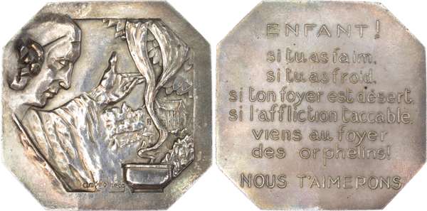 Belgium, “Home of the Orphans”, Art Deco Silvered Bronze Medal (47mm/48.89gm) by Angelo Hecq (1901–1991). Woman, right, pointing the way to the orphanage, bowl to right with smoke rising. Rev. CHILD! If you are hungry, if you are cold, if your home is deserted, if affliction overwhelms you, come to the home of orphans! WE WILL LOVE YOU (translated). Extremely Fine, toned with orange hues.