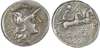 M. Atilius Saranus (148 BC) AR Denarius, Rome, 3.78g. Helmeted head of Roma facing right, X (mark of value) behind. Rev.
