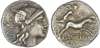 C. Titinius (141 BC) AR Denarius, Rome, 3.81g. Helmeted head of Roma facing right, XVI (mark of value) behind. Rev. Victory,