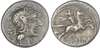Q. Philippus (129 BC) AR Denarius, Rome, 3.73g. Helmeted head of Roma facing right, mark of value behind. Rev. Horseman, wearing crested helmet and holding spear, riding right, Q•PHILIPVS below, ROMA in exergue. (Crawford 259/1; Sydenham 477). Very Fine.