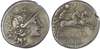 Spurius Afranius (150 BC) AR Denarius, Rome, 3.75g. Helmeted head of Roma facing right, X (mark of value) behind. Rev.