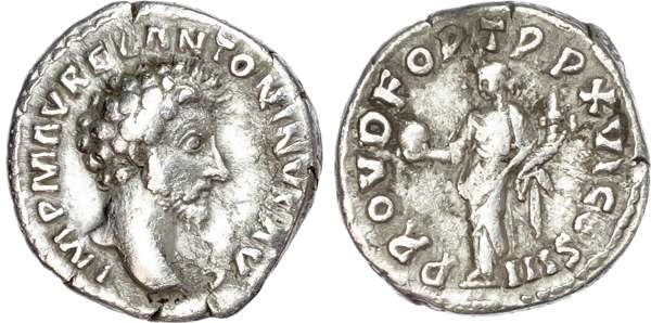 IMP M AVREL ANTONINVS AVG, laureate head of Marcus Aurelius right. Rev. PROVD FORT P P XVI COS III, Providentia standing left, holding globe and cornucopiae. (RIC 25; RSC 510a). Very Fine.