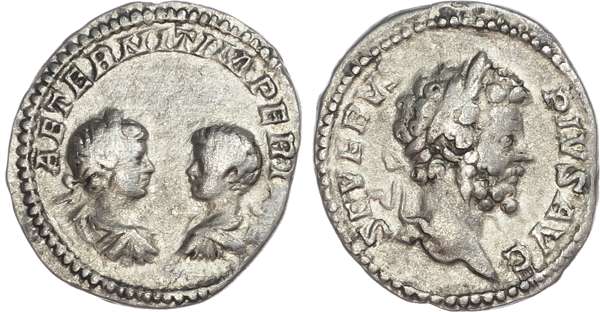 SEVERVS PIVS AVG, laureate head of Septimius Severus right. Rev. AETERNIT IMPERI, facing, draped busts of Caracalla (left, laureate) and Geta (right, bareheaded). (RIC 251). Good Very Fine. Very Rare.