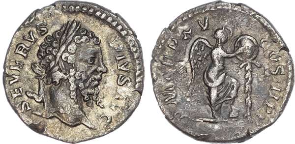 SEVERVS PIVS AVG, laureate head of Septimius Severus right. Rev. PM TR P XV COS III P P, Victory standing right, foot on globe, inscribing shield set on palm tree. (RIC 211). Very Fine.