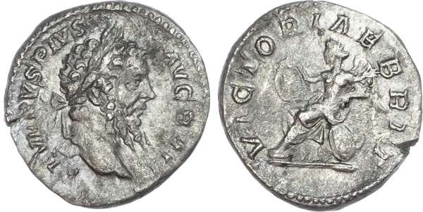 SEVERVS PIVS AVG BRIT, laureate head of Septimius Severus right. Rev. VICTORIAE BRIT, Victory seated left on shield, holding shield and palm. (RIC 335; RSC 731). Very Fine.