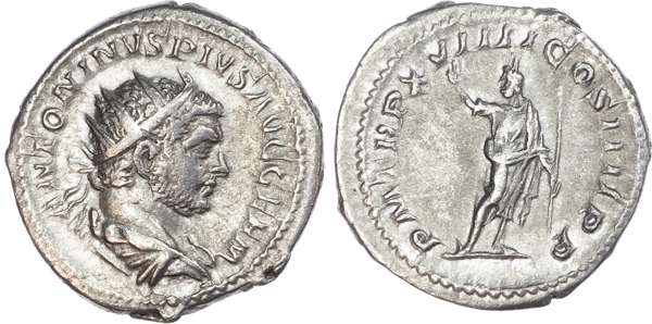 ANTONINVS PIVS AVG GERM, radiate and draped bust of Caracalla right. Rev. PM TR P XVIIII COS IIII P P, Serapis standing right, head left, holding sceptre and raising left arm. (RIC 280d; BMC 165). Good Very Fine.