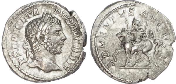 P SEPT GETA PIVS AVG BRIT, laureate head of Geta right. Rev. ADVENTVS AVGVSTI, Geta on horseback left, raising hand and holding sceptre. (RIC 84). Good Very Fine.