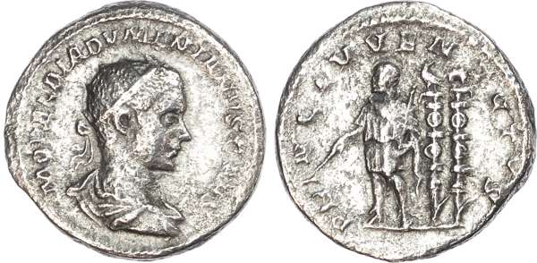 M OPEL DIADVMENIANVS CAES, radiate, draped and cuirassed bust right. Rev. PRINC IVVENTVTIS, Diadumenian standing left, two standards behind. (RIC 106). Very Fine. Somewhat rough. Rare.