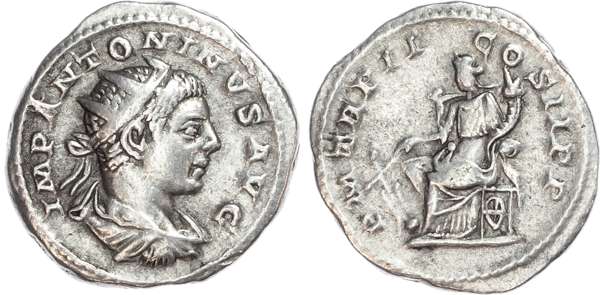IMP CAES M AVR ANTONINVS AVG, radiate, draped and cuirassed bust right. Rev. PM TR P II COS II P P, Fides seated left, holding rudder on globe and cornucopiae. (RIC 19). Very Fine.