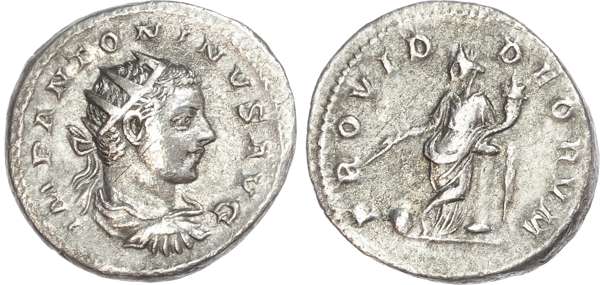 IMP CAES M AVR ANTONINVS AVG, radiate, draped and cuirassed bust right. Rev. PM TR P II COS II P P, Fides seated left, holding rudder on globe and cornucopiae. (RIC 19). Good Very Fine.