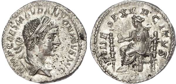 IMP CAES M AVR ANTONINVS AVG, laureate, draped and cuirassed bust right. Rev. FIDES EXERCITVS, Fides seated left, holding eagle, flanked by two standards. (RIC 71). Nearly Extremely Fine. Somewhat mottled surfaces.