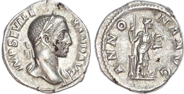 IMP SEV ALEXAND AVG, laureate head of Severus Alexander right. Rev. ANNO-NA AVG, Annona standing facing, head right, holding modius and rudder on globe. (RIC 190). Very Fine.