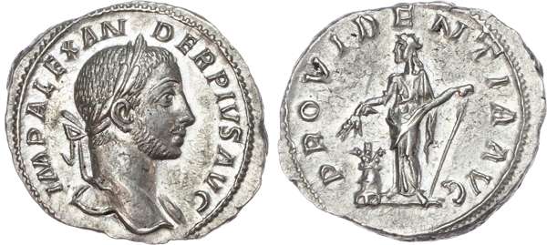 IMP ALEXANDER PIVS AVG, laureate head of Severus Alexander right. Rev. PROVIDE-NTIA AVG, Providentia standing left, holding grain ears and cornucopiae. (RIC 250). Extremely Fine.