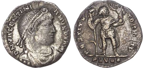 DN VALENTINI-ANVS P F AVG, diademed, draped and cuirassed bust right. Rev. RESTITV-TOR REIP, Emperor standing left, head right, holding labarum topped with Christogram and Victory on globe, PLVG in exergue. (RIC 43). Fine.