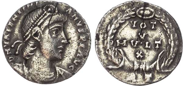 DN VALENTINI-ANVS P F AVG, diademed, draped and cuirassed bust right. Rev. VOT / V / MVLT / X, within a laurel wreath with medallion at apex, R T in exergue. (RIC 10a.2; RSC 70f). Very Fine. Flan crack.