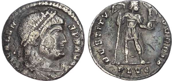 DN VALEN-S P F AVG, diademed, draped and cuirassed bust right. Rev. RESTITV-TOR REIP, Emperor standing left, head right, holding labarum topped with Christogram and Victory on globe, PLVG in exergue. (RIC 6f.1; RSC 28b). Fine.