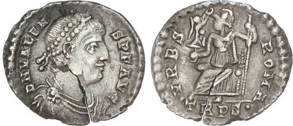 DN VALEN-S P F AVG, diademed, draped and cuirassed bust right. Rev. VRBS – ROMA, Roma seated left, holding sceptre and Victory on globe, TRPS• in exergue. (RIC 27e; RSC 109a). Very Fine. Flan crack.