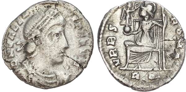 DN VALEN-S P F AVG, diademed, draped and cuirassed bust right. Rev. VRBS – ROMA, Roma seated left, holding sceptre and Victory on globe, RQ in exergue. (RIC 11b.2; RSC 109e). Fine. Flan crack.