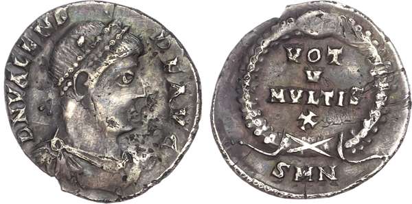 DN VALENS P F AVG, diademed, draped and cuirassed bust right. Rev. VOT / V / MVLT / X, within a laurel wreath, SMN in exergue. (RIC 20b; RSC 91f). Good Fine. Obverse a little rough.