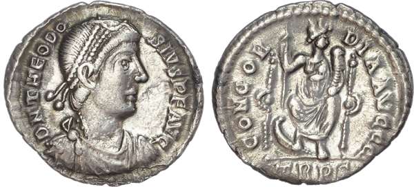 DN THEODO-SIVS P F AVG, diademed, draped and cuirassed bust right. Rev. CONCOR-DIA AVGGG, Constantinopolis enthroned facing, head right, holding sceptre and cornucopiae, foot on prow, TRPS in exergue. (RIC 55a). Good Very Fine. Full flan.