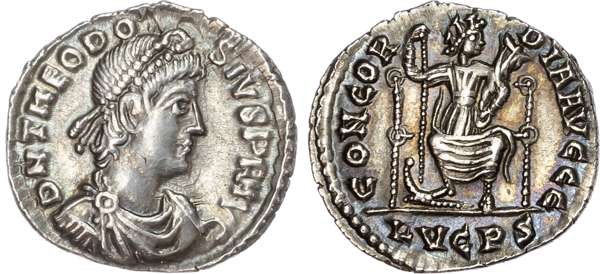 DN THEODO-SIVS P F AVG, diademed, draped and cuirassed bust right. Rev. CONCOR-DIA AVGGG, Constantinopolis enthroned facing, head right, holding sceptre and cornucopiae, foot on prow, LVGPS in exergue. (RIC 24b). Good Extremely Fine. Full flan. A superb example with no flan cracks.