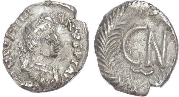 DN IVSTINVS PP AV, diademed, draped and cuirassed bust right. Rev. CN, within a wreath. (MIB 37; Sear 411). Very Fine. Very Rare.