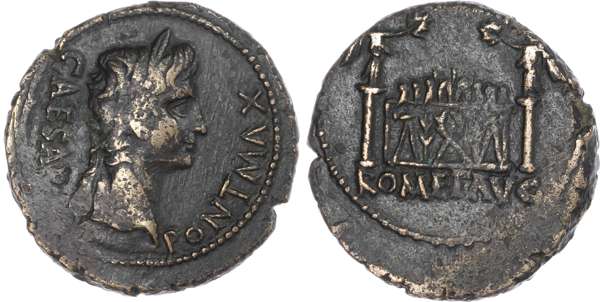 CAESAR PONT MAX, laureate head of Augustus right. Rev. Altar of ‘Roma et Augustus’ at Lugdunum, ornamented, flanked left and right by Victories standing on columns facing inwards towards one another holding wreaths and palms, ROMA ET AVG in exergue. (RIC 230; BMC 550). Very Fine.