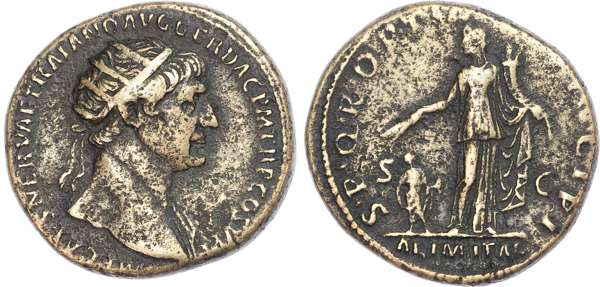 IMP CAES NERVAE TRAIANO AVG GER DAC P M TR P COS V P P, radiate head of Trajan right. Rev. SPQR OPTIM[O PR]INCIPI, S-C across fields, Abundantia standing left, holding two ears of corn in right hand and cornucopia in left hand, with a child holding roll in left hand on her left side, ALIM ITAL in exergue. (RIC 460; BMC 918). Good Fine.