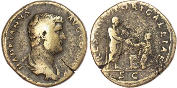 HADRIANVS AVG COS III P P, bare and draped bust of Hadrian right. Rev. RESTITVTORI GALLIAE, Hadrian, togate, on left standing right, holding scroll in left hand and extending right hand to raise kneeling Gallia, S C in exergue. (RIC II.3 1849; BMC 1806). Fine. Rare.
