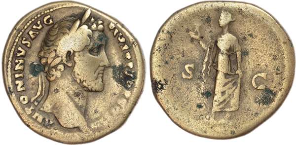 ANTONINVS AVG PIVS P P TR P COS III, laureate head of Antoninus Pius right. Rev. S-C across fields, Spes advancing left, holding flower up in right hand and raising fold skirt with left hand. (RIC 626; BMC 1289). Fair.