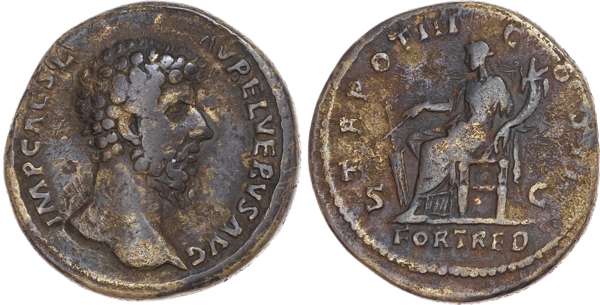 IMP CAES L AVREL VERVS AVG, bare head of Lucius Verus right. Rev. TR POT III COS II, S-C across fields, Fortuna seated left, holding rudder set on ground in right hand and cornucopia in left hand, FORT RED in exergue. (RIC 1345; BMC 1053). Fine.