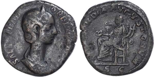 SALL BARBIA ORBIANA AVG, draped bust right. Rev. CONCORDIA AVGVSTORVM, Concordia seated left, holding patera and double cornucopiae. (RIC 655; BMC 296). About Fine. Smoothed. Scarce.