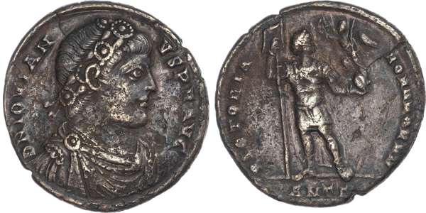 D N IOVIAN-VS P F AVG, pearl-diademed, draped and cuirassed bust of Jovian right. Rev. VICTORIA-ROMANORVM, Jovian in military dress standing right, standard raised in right hand, and Victory holding wreath and palm-branch standing left on globe held in left hand of Jovian, ANTΔ mint-mark in exergue. (RIC 228). Fine. Scratches. Scarce.