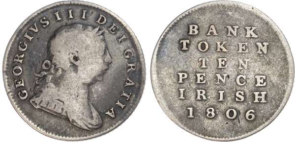 George III (1760-1820), Bank of Ireland Ten Pence Token, 1806. Laureate and draped bust right, GEORGIUS III D GRATIA. Rev, BANK TOKEN TEN PENCE IRISH 1806 (S. 6617). Fine.