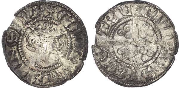 +EDWA REX AGL DNS HYB, crowned bust facing. Rev. CIVITAS CESTRIE, long cross pattée with trefoil of pellets in each quarter, 1.32g. (S. 1420; N. 1022). Good Fine.