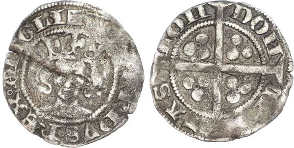 +EDWARDVS REX ANGLI, crowned bust facing. Rev. CIVITAS LONDON, long cross pattée, annulets surrounded by trefoil of pellets in each quarter, 0.87g. (S. 1584; N. 1149). Almost Very Fine, once creased.