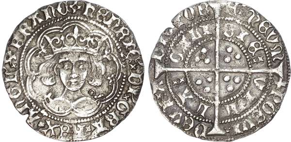 +HENRIC DI GRA REX ANGL Z FRANC, crowned bust facing, trefoil to left of crown, annulets above shoulders. Rev. +POSVI DEVM ADIVTORE MEVM / VILLA CALISIE, long cross pattée with trefoil of pellets in each quarter, annulet in middle of one quarter, 3.62g. (S. 1854; N. 1427). Very Fine.