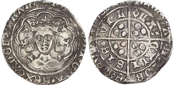 +HENRIC DI GRA REX ANGL Z FRANC, crowned bust facing. Rev. +POSVI DEVM ADIVTORE / VILLA CALISIE, long cross pattée with trefoil of pellets in each quarter, 3.35g. (S. 1890; N. 1475). Very Fine, well struck.