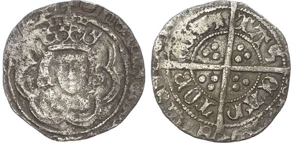 +HENRIC DI GRA REX ANGL Z FR, crowned facing bust within a tressure of seven arches. Rev. POSVI DEV A DIVTOR MEV / CIVTAS CANTOR, long cross forchée with trefoil of pellets in each quarter, 1.38g. (S. 2211; 1712). Fine. Clipped.