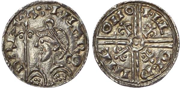+HAROD REX A:, diademed and armoured bust left, sceptre before, rev. +LEOFÞINE ON O, voided long cross extending from central circular panel containing pellet, 1.18g, (N.803; S.1165). Extremely fine with a hint of a very light gold tone.