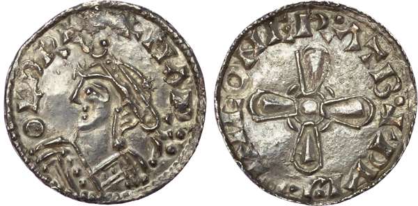 +HAR OLD REX, diademed bust right, Rev. PVL· FPINE ON GR·ΛTB·, cross of four ovals united by concentric circles with a central pellet, 1g/8h. (BMC I; N. 802; S. 1163). Almost Extremely Fine. Die rust to obverse.