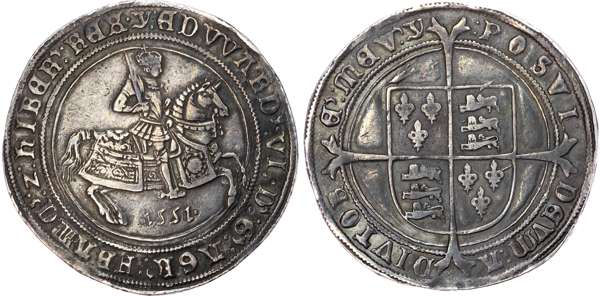 Armoured King with upright sword on horseback right, date 1551 below, linear and beaded circles surrounding, legend surrounds EDWΛRD VI DG ΛGL FRANC Z HIBER REX. Rev, long cross fourchée over quartered shield of arms, reads POSVI DEVM Λ DIVTOR E MEV, 31.13gm (S. 2478; N. 1933). Good Very Fine, struck on a full flan and free from the usual stress marks.
