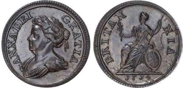 Struck in copper on a small flan 21mm, dies 2 + E, draped bust facing left, legend reads ANNA DEI – GRATIA. Rev, Britannia seated left on globe, legend reads BRITAN-NIA, edge plain, date in double lined exergue (S.3625; BMC 741). Good extremely fine.